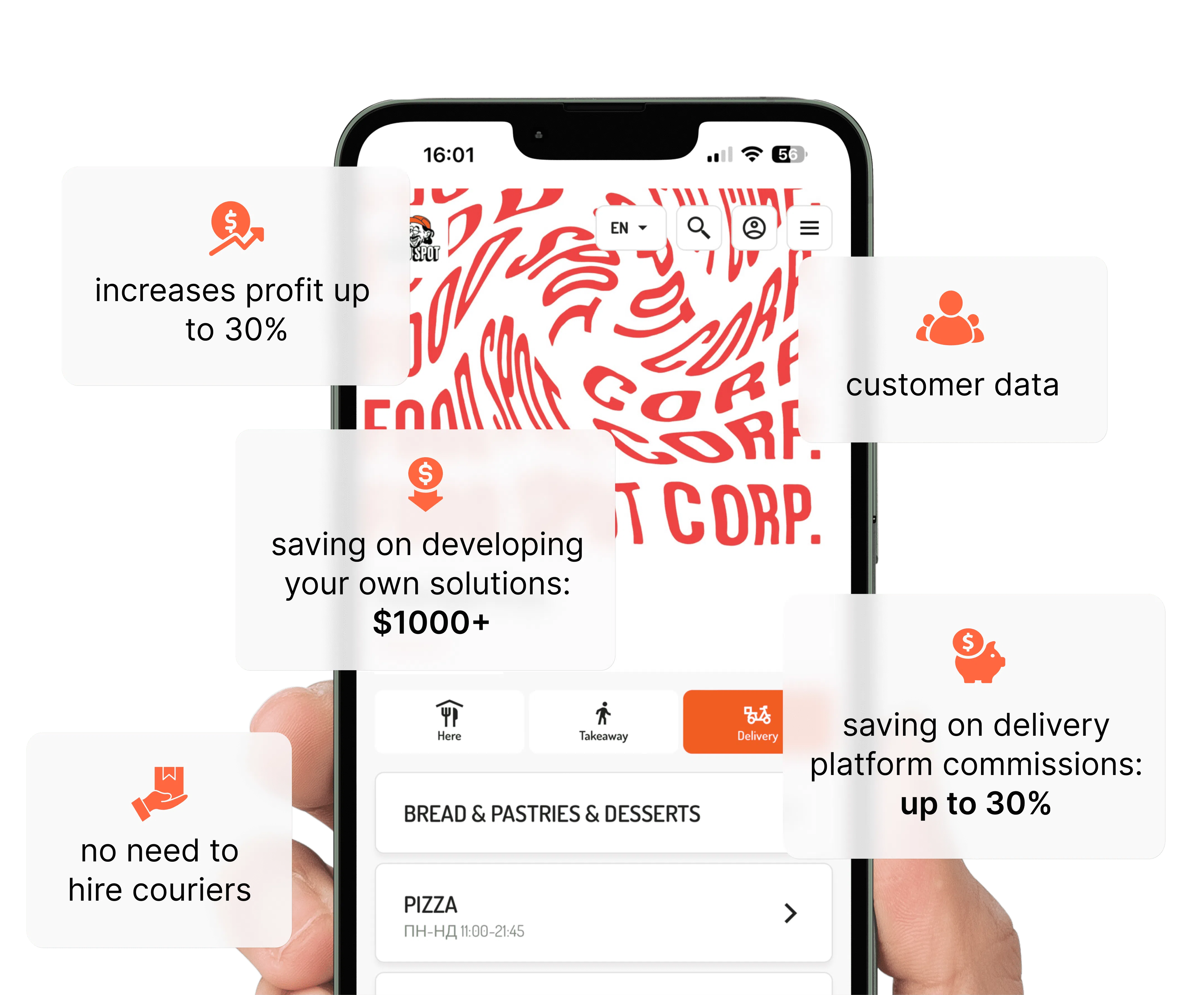 increases your profit, as there is no need to overpay to third-party services and for takeout orders.