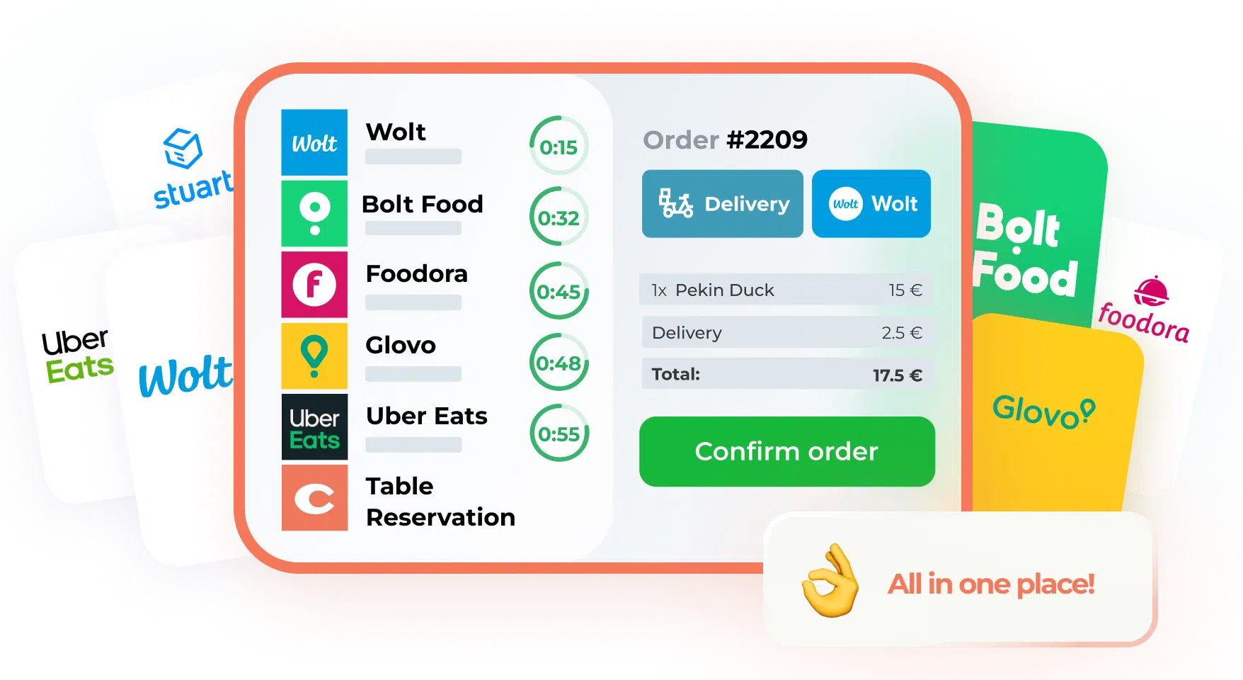 Manage all orders from Wolt, Bolt, Glovo, Stuart, UberEats and Foodora marketplaces from one device.
