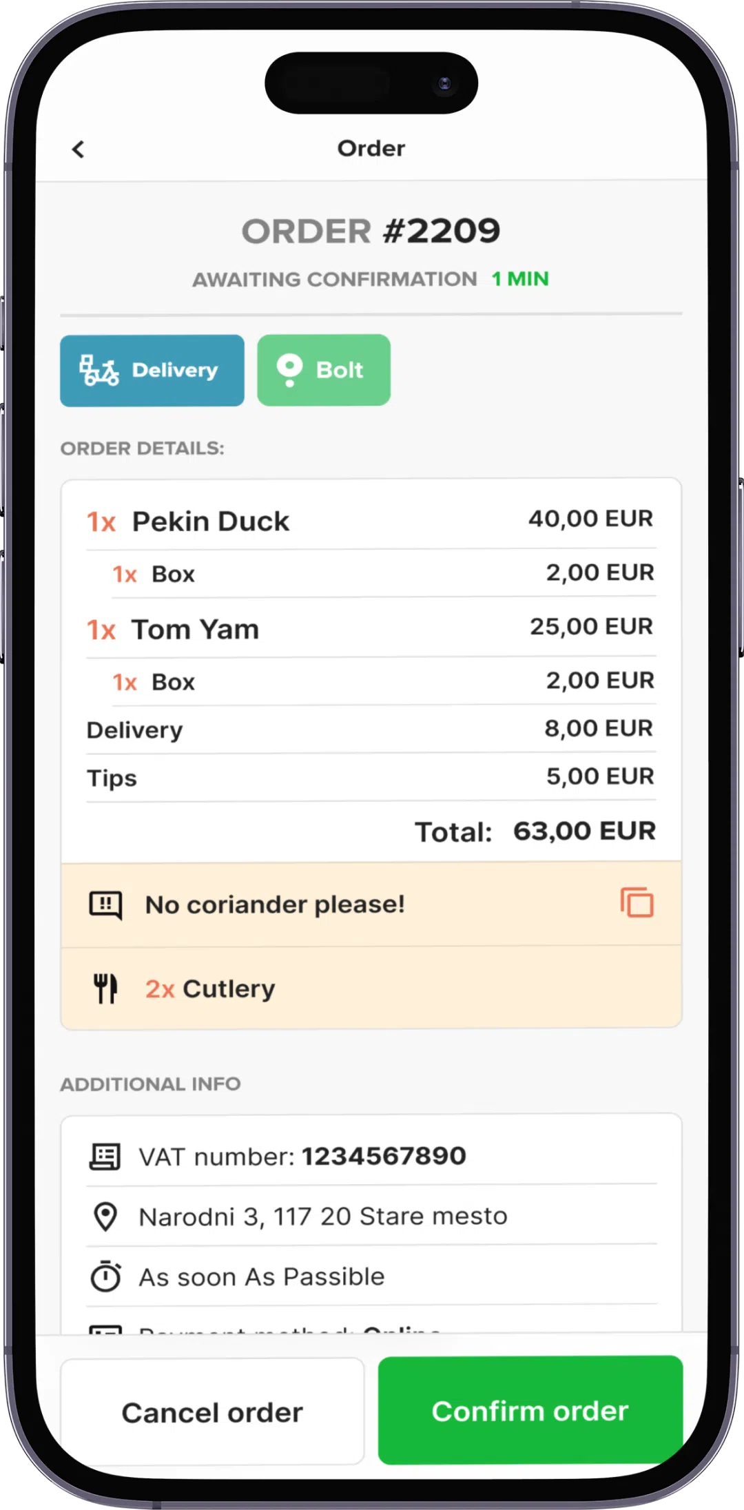 to immediately optimize the delivery order process, simplify the team's work with aggregators, and don’t worry about all processes and operational issues. Integration with Bolt is also available, which you can learn more about here.