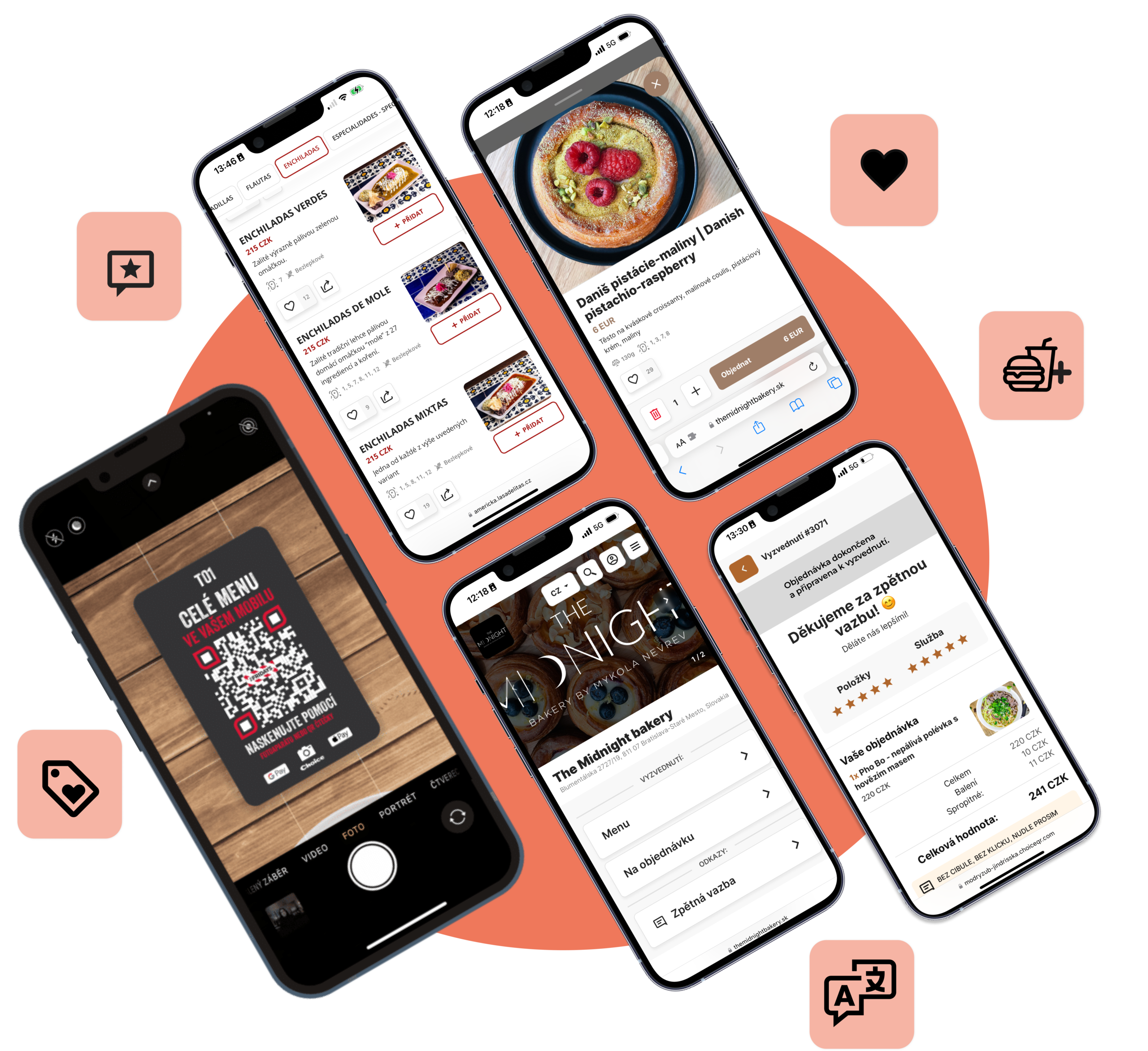 Menu funguje s QR kódem nebo odkazem – není potřeba stahovat aplikaci. Zákazníci okamžitě vidí veškerou nabídku s atraktivními fotografiemi, videi a podrobnými popisy. QR menu obsahuje automatický překlad v 99 jazycích.